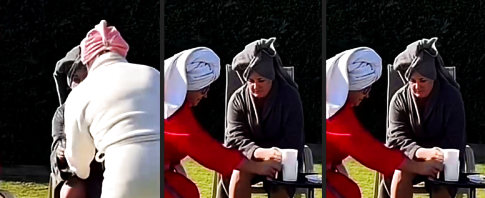 Zwei Damen beim meditativen Kaffeeklatsch im Bademantel-Look. Die Zen-Atmosphäre schreit förmlich nach Störung - und wird erhört....