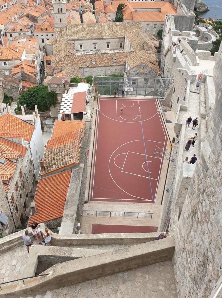 59: Dubrovnik... anstatt für die Stadtmauertour zu bezahlen geh zu dem Basketballplatz, da ist nichts los und man hat ne tolle Aussicht. Am Zaun rechts geht es in ein Gießerreimuseum, da ist es fein kalt im Sommer während draußen alles kocht :)