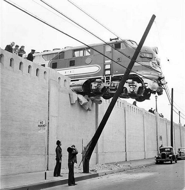 #6: Die Santa Fee Diesellokomotive durchbrach den Prellbock und hängt am 25. Januar 1948 über der Aliso St, Los Angeles, in der L.A. Union Station, damals eine der größten und modernsten Bahnhöfe Amerikas: History of the railroad and L.A. Union Station - YouTube