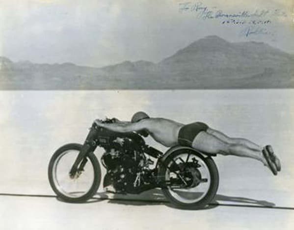 #76: Roland „Rollie“ Free bricht den amerikanischen Motorrad-Geschwindigkeitsrekord auf den Bonneville Salt Flats im Nordwesten von Utah, USA, 1948.