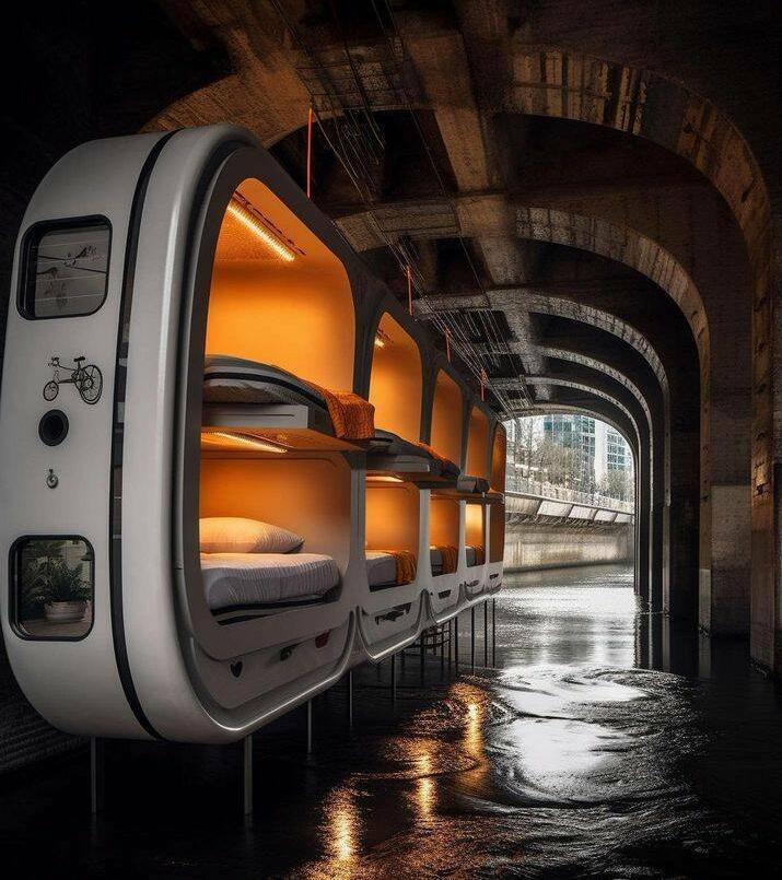 AI-Vision von Schlafplätzen für Obdachlose (natürlich unter Brücken): These AI-generated self-contained living pods under city bridges bring an affordable solution to society problems - Yanko Design
