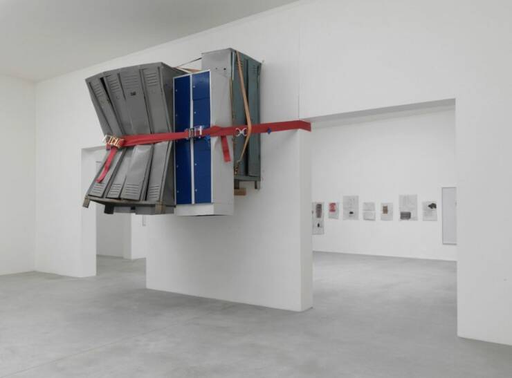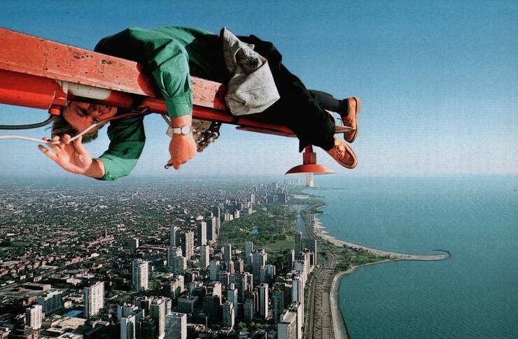 A man balances on Chicago's John Hancock Center while fixing a cable. The photo was taken for a story in the February 1989 issue examining the lives of those who lived, worked, and met in the tower.