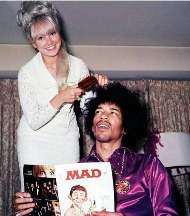 #61 Jimi Hendrix getting his hair styled before a gig while reading MAD magazine. (1968) ?
