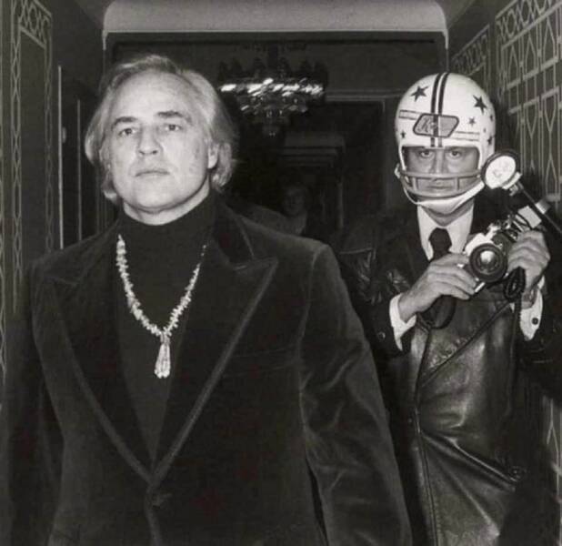 #107 Paul Schmulbachs Foto zeigt Marlon Brando und Fotograf Ron Galella beim Benefizball der American Indians Development Association im Waldorf Astoria Hotel in New York am 26. November 1974. Warum Paparazzo Galella einen Helm trägt? Bei einer vorangegangene Begegnung hatte Brando ihm den Kiefer gebrochen und mehrere Zähne ausgeschlagen.