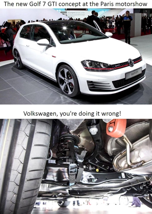 #109 - Schon mal auf der IAA unter die Autos geschaut? Alter Aussteller-Trick: Tieferlegung mit Spanngurt. Für Werbeaufnahmen werden gewöhnlich Sandsäcke in den Motorraum geladen....