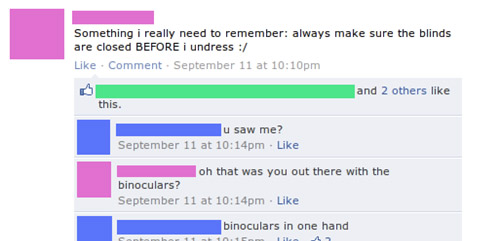 sie: \"was ich mir wirklich merken sollte: immer nachschauen, ob die vorhänge zu sind, bevor ich mich auszieh\" er: \"hast du mich gesehen?\" sie:\" oh das warst du da draußen mit dem fernglas?\" er:\" fernglas nur in einer hand\" --> FYI der witz ist, dass er mit der andern hand sich einen runterholt!