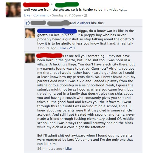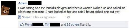 Die ganzen Facebook-Sprüche werden langsam echt nervig. 1. Hälfte von denen sind doch mittlerweile eh Fake oder uralt, gibt\'s schon seit Jahren auf den vielen bash-Seiten zu finden. Und 2. muss man doch nicht wegen jedem Gag auf Facebook gleich einen Screenshot machen und das um den Planeten schicken als hätte man das \"lol\" neuerfunden. Okay, diese Postings können trotz Fake lustig sein - aber, hey: Wenn einer einen Witz oder einen geilen Spruch loswerden will, kann er das doch auch im sogenannten REAL LIFE beim Bierchen oder sonstwo tun (sofern vorhanden) ... und denn auch ohne Screenshot. PS: \"Nine Eleven\" im Kinderzimmer, oh ha! Siehe letzten Donnerstag im Picdump ... ^^