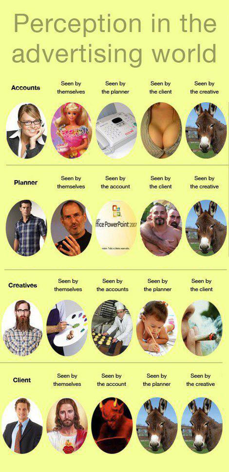 ok ih will mL net so sei, die einzelnen überschriften sind funktionen in einem werbebüro - oder werbeagentur.. keyACCOUNT manaGER ist vielleich das was zum verständnis fehlt. und dann wer sieht wen wie.. z.b. due accounts sind naturgemäß hübsche junge mädels (der männliche kunde der die werbung will sist von sowas beeindruckt) - sie sehen sich als die barbies = wunderhübsch, erfolgreich blabla.. der planer sieht sie aber als quaselstrippen weil die accounts die ganze zeit am tel hängen und er halt immer nur anrufe von denen bekommt wenn kunden sich beschweren (die kunden machen das beim ACCount, weil der ihr ansprechpartnwer ist). der kunde sieht die hübschen mädels natürlich als sexy an - ist sooo , geile mädels teilweise- und der kreative denkt von accounts die sind esel = keine ahnung von der materia. den rest wirst du jtzt auch selbst hinkriegen hogf ich mal xDDD
