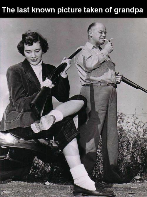 Sie hält den Lauf Richtung Großvater. Das macht man nicht, falls sich ein Schuss löst.