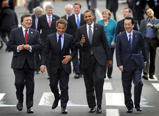 von links nach rechts: erste Reihe: Barroso (EU), Sarkozy(Frankreich), Obama(USA), Kan (Japan) zweite Reihe: Harper (Kanada), Cameron (Großbritannien), Merkel (Deutschland), Medwedew (Russland) und Di Caprio Der Witz ist, das Di Caprio da nicht reinpasst, siehe auch: tinyurl.com/8to4mn3