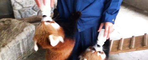 Der im Ost-Himalaya vorkommende Feuerfuchs (oder auch Katzenbär) beim Essen fassen.