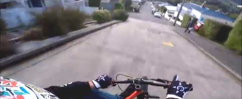 Der etwas andere Chillout-Modus. Mit Hochgeschwindigkeit auf drei Rädern die steilen Straßen von Neuseeland hinunter donnern.