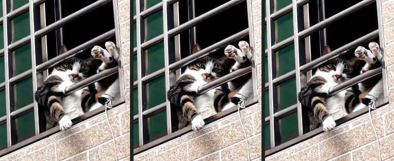 Hinter einem Gitterfenster thront eine Katze in maximaler Entspannung. Mit allen Vieren lässig verknotet, genießt sie ihren sicheren Aussichtspunkt.
