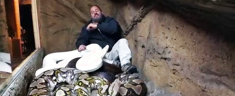 Da gehört schon eine gewaltige Portion Balls oder Not-giving-a-damn dazu, sich in ein Terrarium mit Pythons dieser Größenordnung zu pflanzen, gechillt zu scherzen, auch wenn man um ein Haar das Gesicht abgebissen bekommt. Wer Pythons kennt, weiß, dass die scharfe Hauer haben und eine Menge davon.