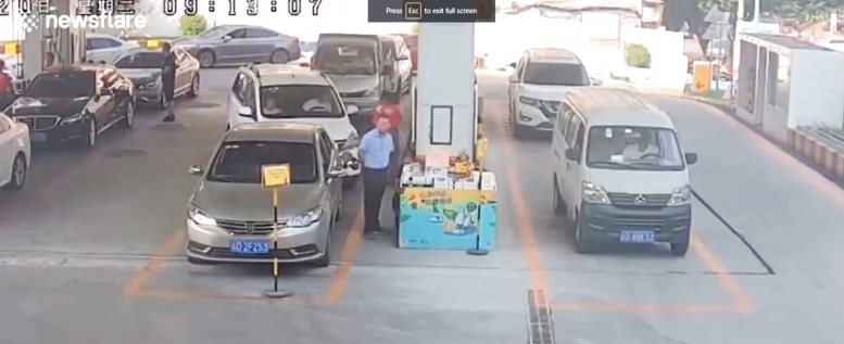 Der typ im hellblauen hemd so besorgt um das Wohlergehen seines autos, dass er flüchtet ohne den Zapfhahn zu ziehen...