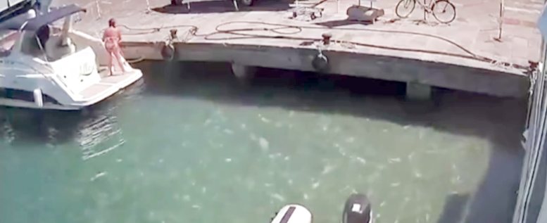 Das was sie da mit dem Schlauch einfüllt ist Wasser! Ist normalerweise bei jeder Bootstanke kostenfrei zu bekommen. Ich vermute das vorher getankt wurde und der Tank bzw die Leitungen oder Filter undicht waren und im Motorraum gegast haben. Der Rest ist Geschichte.