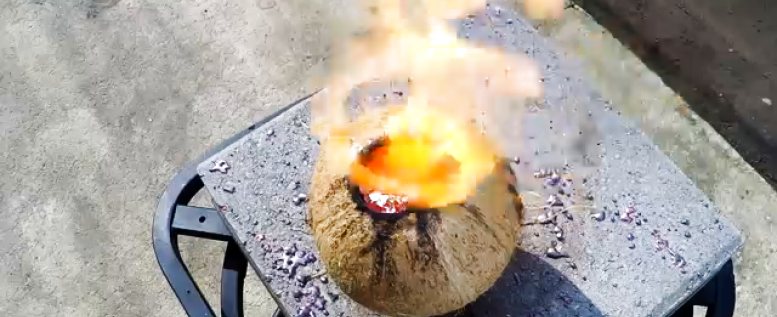 Eine feurige Reaktion, die das Befüllen einer Kokosnuss mit geschmolzenem Kupfer hier zeigt. Ist das Kunst oder kann das weg?