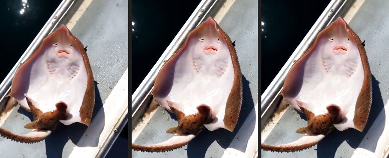 Weil das Tier, sobald es an Land ist, eine langsame Art des Erstickungstod erleidet, da die Kiemen an Luft nicht richtig ihre Funktion erfüllen können. In dieser extremen Stressreaktion, auf den Rücken gedreht und der Sonne exponiert, wird die Berühung dem Tier weiteren Stress bereiten. Man kann ja auch sehen, dass der gesamte Fisch sich krampfhaft zusammehzieht. Von der unerwarteten Berührung kann er auch nichts sehen, da sich die Augen ohnehin auf der anderen Seite befinden. Das was da die Konturen von einem lustigen Gesicht hat, sieht für mich nach Überlebensstress für das Tier aus.Is halt wie Gesichtswurst. Sieht witzig aus, aber wenn man ne Sekunde drüber nachdenkt wirds eklig.