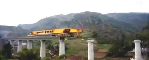 Wie gut, dass in China Brückenpfeiler einfach so im richtigen Abstand und passend ausgerichtet in der Landschaft herumstehen, damit so eine Maschine dann komplett selbstständig eine Brücke bauen kann.